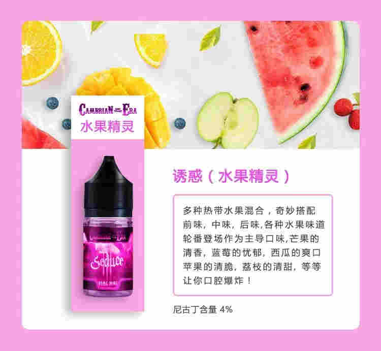 多種熱帶水果混合,奇妙搭配前味,中味,后味,各種水果味道輪番登場作為主導口味,芒果的清香,藍莓的憂郁,西瓜的爽口蘋果的清脆,荔枝的清甜,等等讓你口腔爆炸!尼古丁含量4%
