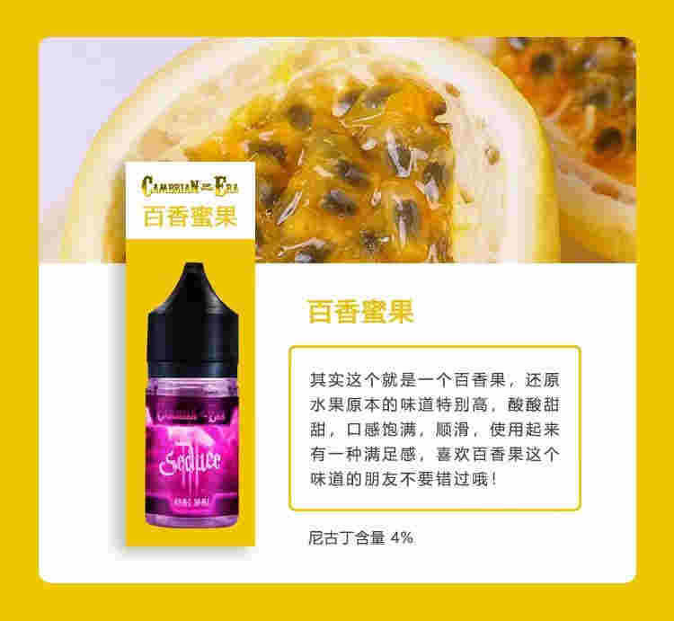 經過多種工序特釀,打造出一款可以在酒局上致敬的口味,微涼的口感,誘人,外加一點小情調讓入口的麥芽香攜帶國人熟悉的啤酒味迸發而出,特別醉人(醉人百香蜜果其實這個就是一個百香果,還原水果原本的味道特別高,酸酸甜甜,口感飽滿,順滑,使用起來有一種滿足感,喜歡百香果這個味道的朋友不要錯過哦!尼古丁含量4%