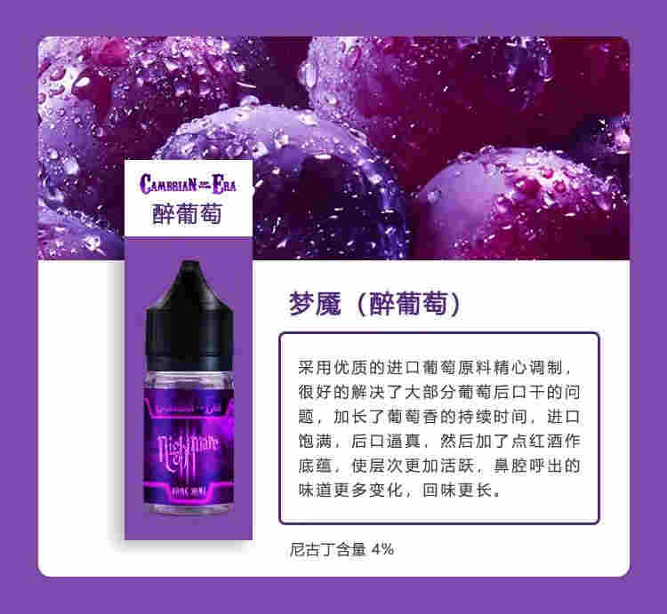 采用優質的進口葡萄原料精心調制,很好的解決了大部分葡萄后口干的問題,加長了葡萄香的持續時間,進口飽滿,后口逼真,然后加了點紅酒作底蘊,使層次更加活躍,鼻腔呼出的味道更多變化,回味更長尼古丁含量4%