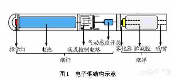 先了解一下電子煙的大致結構,由兩部分組成煙桿和煙彈,前者是為電子煙的加熱裝置供電,而后者則是放置煙液,加熱就會產生煙霧,與普通紙煙一樣,可以讓吸食者吞云吐霧。