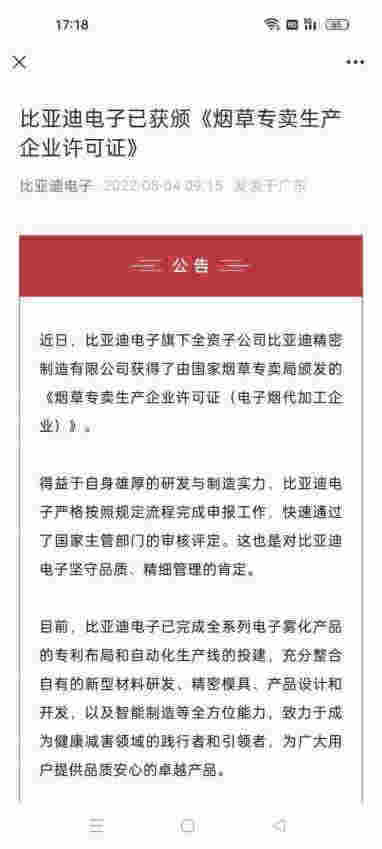 比亞迪電子稱,得益于自身雄厚的研發與制造實力,比亞迪電子嚴格按照規定流程完成申報工作,快速通過了國家主管部門的審核評定。這也是對比亞迪電子堅守品質、精細管理的肯定。目前,比亞迪電子已完成全系列電子霧化產品的專利布局和自動化生產線的投建,充分整合自有的新型材料研發、精密模具、產品設計和開發,以及智能制造等全方位能力,致力于成為健康減害領域的踐行者和引領者,為廣大用戶提供品質安心的卓越產品。新政策下,作為電子霧化領域領導廠商之一,比亞迪電子堅決擁護國家對電子煙的相關政策,依法合規展開生產經營,為行業健康有序發展做出積極貢獻。