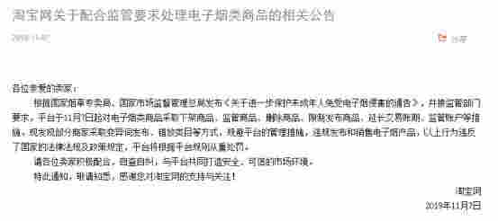 2019年11月7日凌晨,天貓官網發布聲明:“接監管部門要求,平臺于11月7日起對電子煙類商品采取下架商品、監管商品、刪除商品、限制發布商品、延長交易賬期、監管賬戶等措施?,F發現部分商家采取變異詞發布、錯放類目等方式,規避平臺的管理措施,違規發布和銷售電子煙產品,以上行為違反了國家的法律法規及政策規定,平臺將根據平臺規則從重處罰?!币馕吨嬲龑﹄娮訜煹幕ヂ摼W監管,現在已經無法在淘寶、天貓等渠道搜索到相關信息。