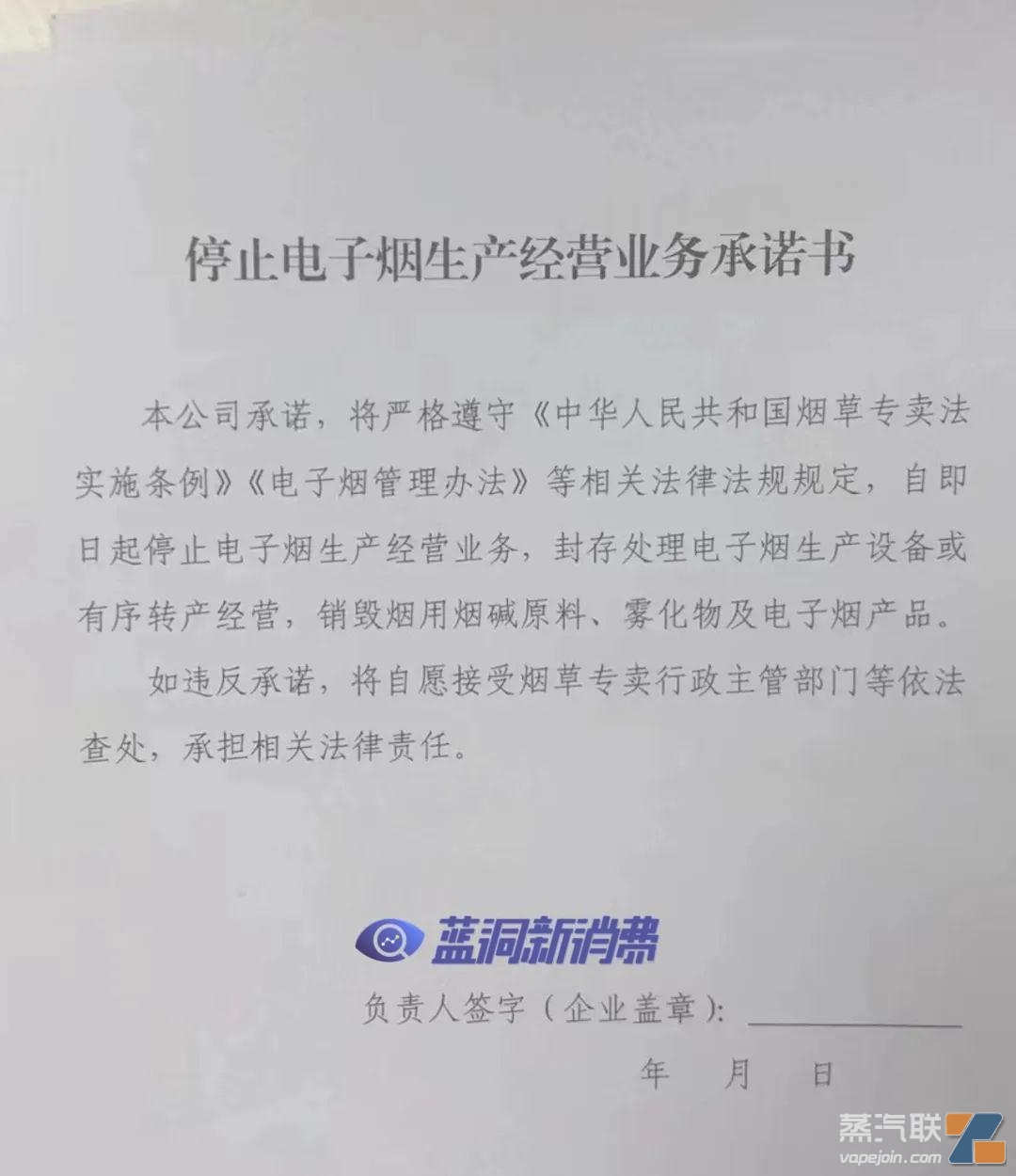 承諾書要求未持證企業承諾遵守煙草專賣法實施條例和電子煙管理辦法規定,自簽署之日起停止電子煙生產經營業務,封存處理電子煙生產設備或有序轉產經營,銷毀煙用煙堿原料、霧化物及電子煙產品。