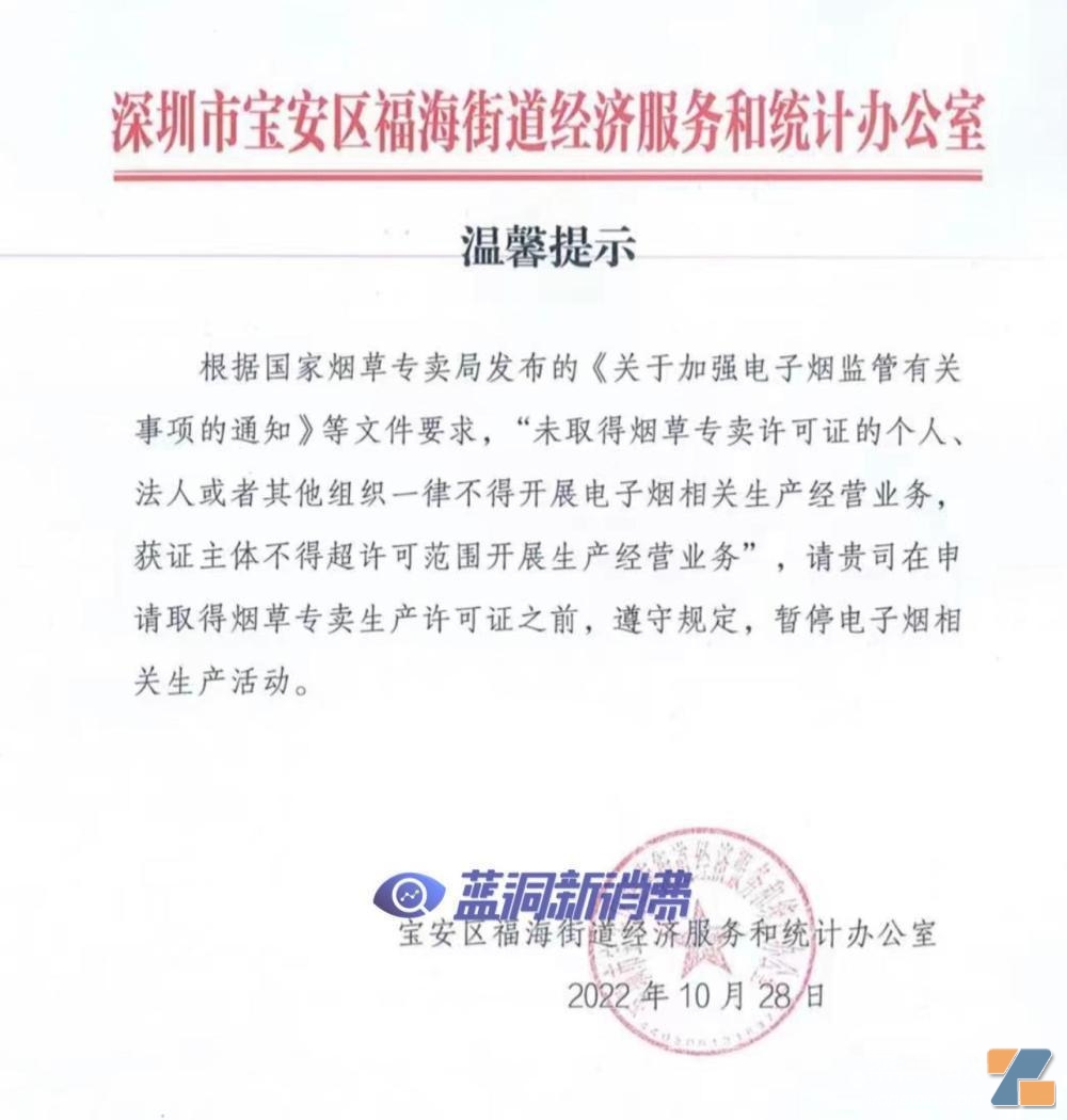 深圳寶安區福海街道經濟服務和統計辦公室也在10月28日向未獲證企業發送了暫停電子煙相關生產獲活動的「溫馨提示」。