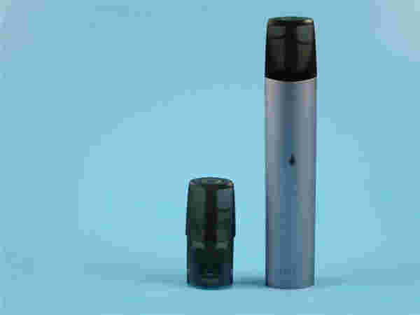 悅刻換彈霧化煙的煙槍灰藍色的金屬外觀質感十足,LED燈滅的時候黑色,亮起是亮白色,取出的煙彈采用透明磨砂硬質塑料材質設計,可以看到內部的煙油部分,在底部顏色區域附件還雕琢著數字代號。