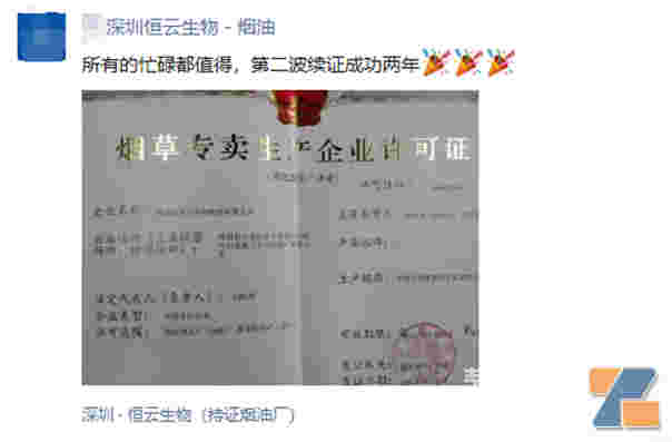 從6月9日國家煙草專賣局發布換證公告以來,從多個渠道獲悉,第一批換證單位陸續出爐,煙油企業占多數,如梵活、華加生物、恒云生物等,還有品牌商也拿到了,如億光年。