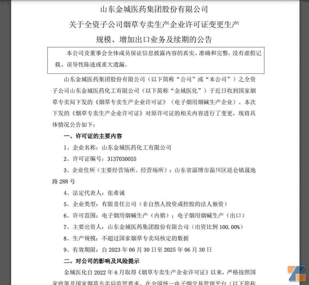 金城醫藥:許可證已變更,可從事電子煙用煙堿出口