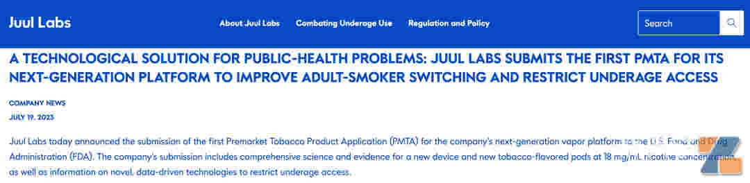 JUUL官網于7月19日發布的一則消息顯示,Juul Labs宣布已經為其下一代平臺向FDA提交了PMTA申請。申請中除了包含關于新設備,以及尼古丁濃度為18mg/ml的新款煙草口味煙彈的全面的科學依據外,還有關于限制未成年人使用的新技術的相關信息。