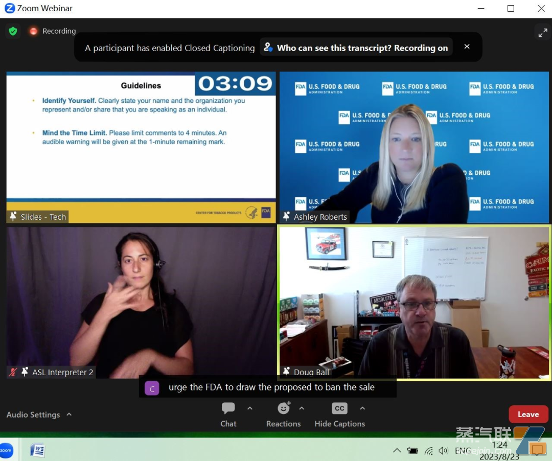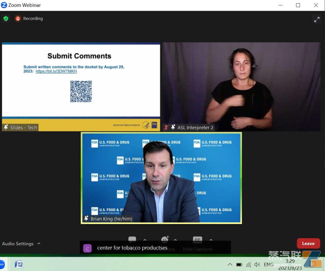 2023年8月22日北京時間時間晚上10點至23日凌晨3點半,美國FDA煙草產品中心(Center for Tobacco Products, CTP)舉行了關于制定5年戰略計劃的線上聽證會。該會議持續5個半小時,北京中銀(深圳)律師事務所鄭明偉律師團隊楊傲宇博士全程參加并在《聯邦公告》上發表了評論意見。