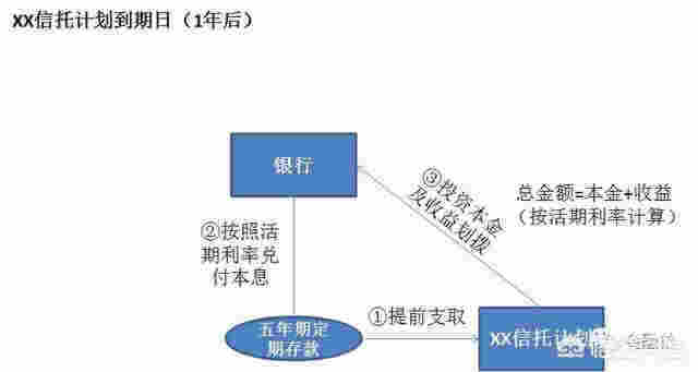 (三)XX信托計劃到期那天,由于XX信托計劃可以處置王小花那筆5年底定期存款,這個時候XX信托計劃向銀行申請提前支取了這筆定期存款。提前支取定期存款當然得按照活期利率計息咯。不過,沒有什么關系,反正XX信托計劃拿到提前支取的本金和利息又按照信托計劃的協議劃撥給了銀行。這樣資金又回到了銀行,而且定期存款的問題解決了,XX信托計劃的問題也解決了。