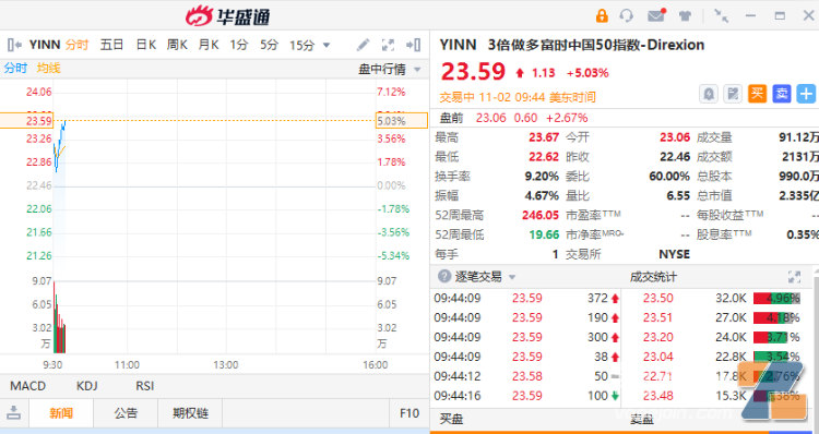 ETF方面,3倍做多富時中國50指數-Direxion漲5.03%,報23.59美元。