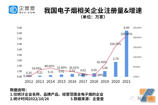 企查查數據顯示,我國現存電子煙相關企業超16萬家。近10年來,我國電子煙相關企業注冊量不斷增加。2019年新增電子煙相關企業1.06萬家,同比增長62.90%。2020年新增2.74萬家,同比增長158.76%。2021年新增8.49萬家,同比增長209.85%。2022年上半年,我國新增電子煙相關企業1.76萬家,同比減少65.895。