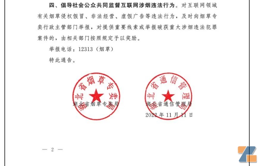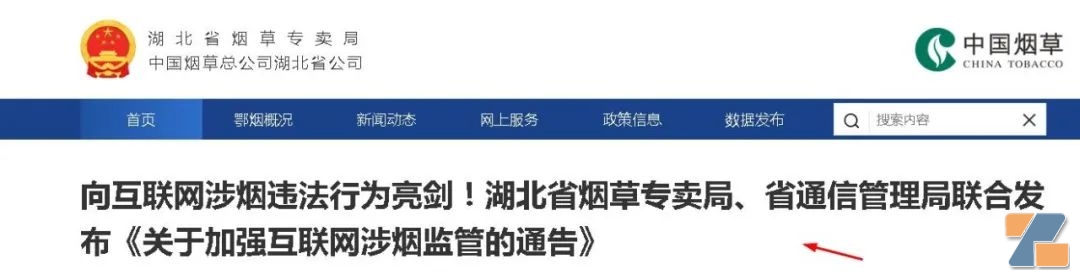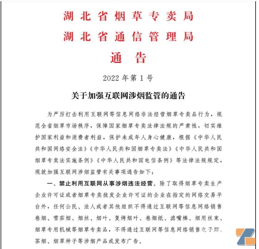 監管是“常態”。 昨天才一個涉案電子煙價格細則,今天又一個對網絡涉煙“亮劍”。 這應該是今年第一個省級文件,湖北兩局聯合發布通告,向互聯網涉煙違法行為“亮劍”! 而且這次亮劍和以往有些不同,增加了一些“類目”。文件由湖北省煙草專賣局和湖北省通信管理局聯合發布,看得出是省級煙草部門聯動省級通信網絡部門一次大行動。即為《湖北省煙草專賣局 湖北省通信管理局關于加強互聯網涉煙監管的通告》文件(簡稱電子煙4條)。 這個還是湖北通信局今年的“第一號文件”。 點擊輸入圖片描述(最多30字)