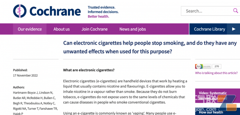 科克倫強調,其不確定對比尼古丁替代療法、無戒煙解決方案支持或僅通過建議和咨詢對比起來,使用尼古丁電子煙會產生的不良影響是否存在差異。