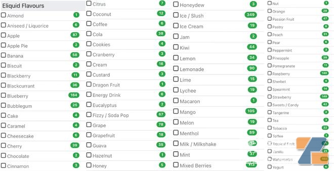 基于VapeClub口味分類標簽,我們大致可以將英國市場一次性口味大致分為水果、飲品、甜品、糖果、堅果、醬、香料幾類。在總共多達71個口味標簽中,與水果相關的標簽多達31個,占比高達44%。換言之,果味為英國一次性市場的絕對主力。