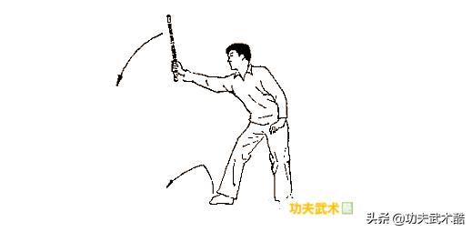 此動要領在于身隨兩手擺動,目先隨左援手轉動,而后當右手持煙筸向右下劈之時,目轉視右煙筸所劈方向。