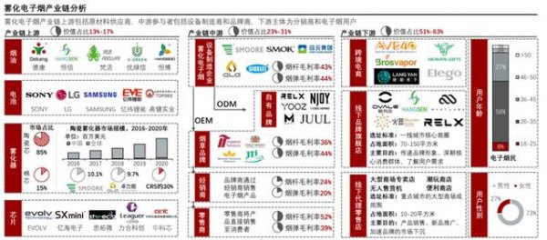 與歐美國家相比,我國電子煙產業雖已形成產業鏈,卻仍處于發展初期。我國涉足電子煙概念的上市公司超過30家,主要集中在原材料和零部件環節,包括煙油、電池、霧化器、芯片、煙具等。