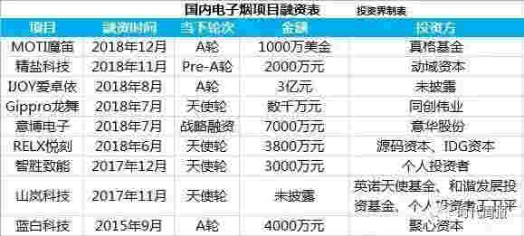 在國際市場熱火朝天的同時,國內市場也不甘落后。2018年,國內有十幾家電子煙公司獲得了包括了IDG、真格基金這類明星投資機構的青睞。此外,2019年不足一個月的時間內,就已有兩家電子煙企業宣布完成千萬元融資。在這波創業潮中,錘子科技001號員工朱蕭木、滴滴前高管汪瑩、同道大叔創始人蔡躍棟、視覺志創始人沙小皮等爭相殺入電子煙賽道。